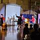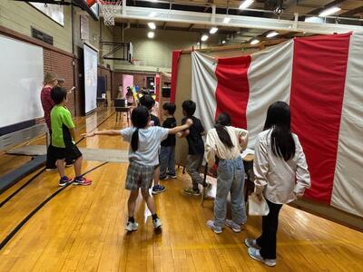写真は3・4年部の練習風景です。舞台袖にいる子どもたちも真剣に様子を見ています。