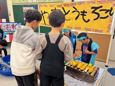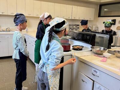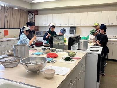 6年生が調理実習で「ジャガイモのハンバーグ」「ほうれん草のおひたし」[きんぴらごぼう」を作っていました。