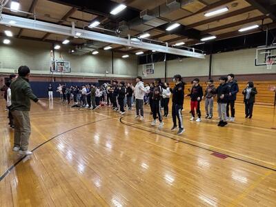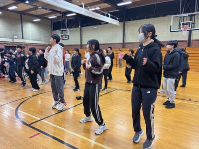 今日の全校朝会はみんなで「スポーツリズムトレーニング」をしました。