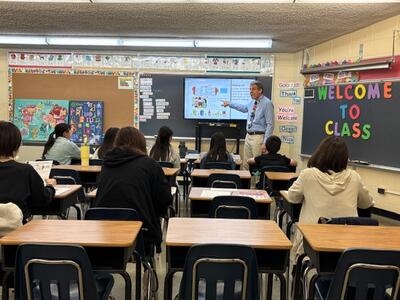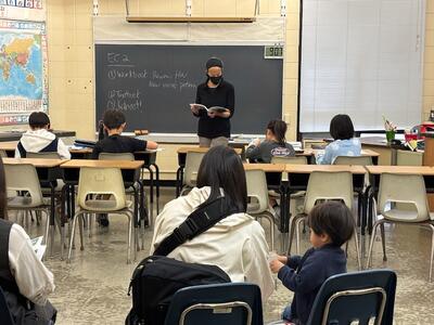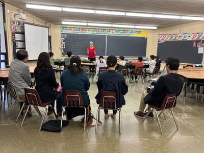 1年生が生活科の学習「がっこうのせんせい だいちょうさ」でインタビューに来ました。