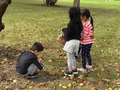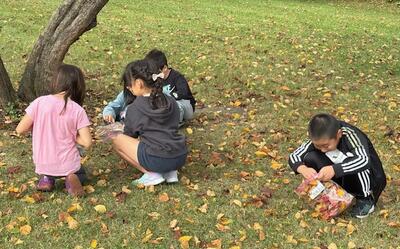 2年生が図工の時間に落ち葉を拾っていました。